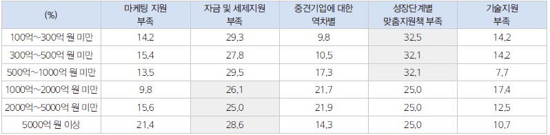 특히 석유제품, 철강/비철금속 제품, 디스플레이, 반도체, 선박 등의 기업이나 수출 규모가 크고 수출 비중이 높은 기업일수록 자금 및 세제지원 부족을 가장 큰 문제점으로 꼽았다. 반면 농수산물, 전기제품, 플라스틱/고무제품, 기계류, 자동차 등의 기업이나 수출 비중이 낮은 기업일수록 성장단계별 맞춤지원책이 부족하다고 응답했다.