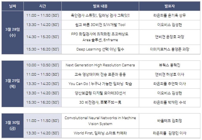 주목할만한 주제발표를 살펴보면, 라온피플은 인공지능 기술인 딥러닝을 주제로 한 '육안검사 스튜핏!, 딥러닝 검사 그뤠잇!!', 'You Can Do ! 누구나 가능한 딥러닝 학습', 'World First, 딥러닝 스마트 카메라', '3D 비전검사, “뭣이 중한디!”' 등의 다양한 발표를 예정하고 있다.