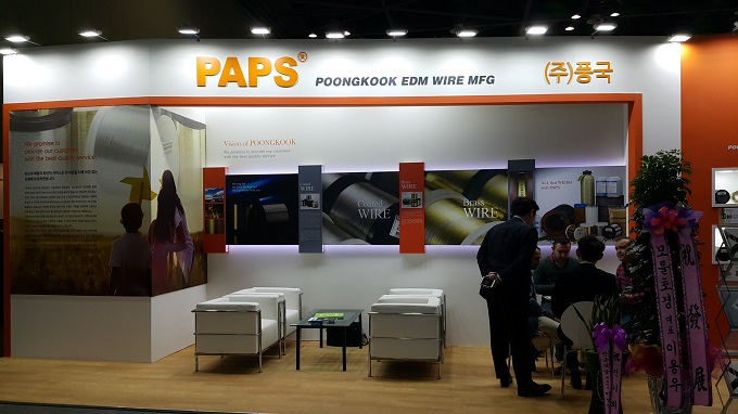 SIMTOS 2018에 참가한 풍국은 다양한 종류의 EDM 와이어를 전시하여 관람객들의 많은 관심을 받았다. 그중 표준 황동와이어인 PAPS Cut-S는 동과 아연의 구성 비율이 63 : 37이고, 940N/mm2 이상의 인장 강도를 갖고 있다. 단일 구조의 동과 아연 합금으로 구성된 표준 방전가공용 전극선으로서 비용 대비 높은 성능을 보이며, 일반적인 가공 환경에도 적합하다. 우수한 직진도를 바탕으로 와이어의 구동 방식에 상관없이 높은 자동결선 성능을 보이며, 와이어 표면처리도 깔끔해 파우더 발생 문제를 해결했다.