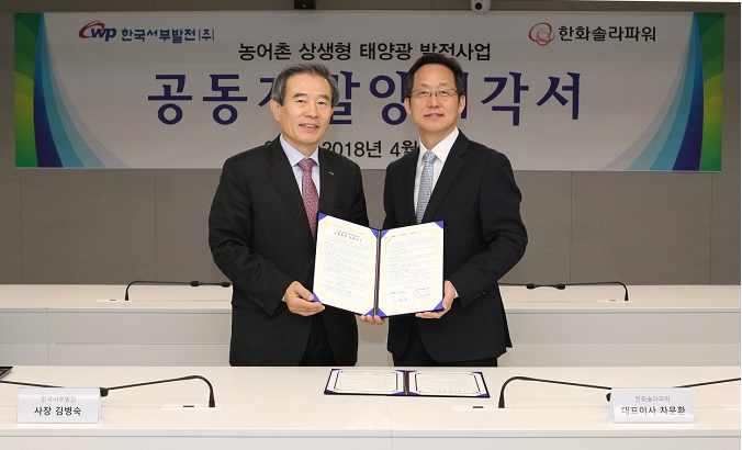한국서부발전(사장 김병숙, 이하 서부발전)은 4월 12일(목) 한화솔라파워(대표이사 차문환)와 「농어촌 상생형 태양광 발전사업 공동개발」을 위한 양해각서를 체결했다.