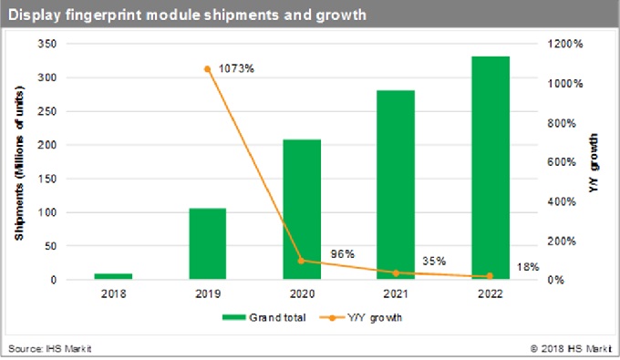 IHS Markit의 신규 보고서 ‘디스플레이 지문인식 기술 시장 2018’에 따르면 디스플레이 일체형 지문인식 솔루션을 탑재한 스마트폰 출하량은 2018년 최소 900만 대에 이르고, 2019년에는 1억 대를 돌파할 것으로 전망된다. 삼성전자, 비보, 화웨이, 샤오미 등 중국 스마트폰 업체가 이 시장을 이끌며, 향후 3년 동안 괄목할 만한 성장세를 이어나갈 것이라는 분석이다.
