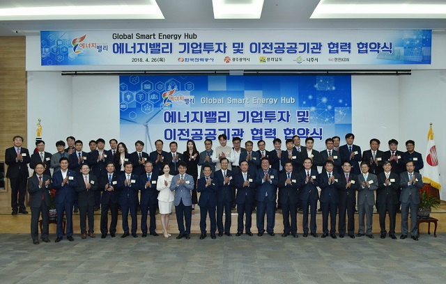 한국전력(대표이사 사장 김종갑)은 4월 26일 본사에서 광주광역시(시장 윤장현), 전라남도(지사권한대행 이재영), 나주시(시장권한대행 조재윤), 한전KDN(사장 박성철)과 함께 LG전자, 에너낙코리아 등 30개 기업과 함께 에너지밸리 투자협약을 체결했다.