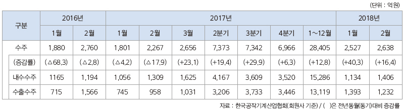 2018년 2월 공작기계 수주는 2,638억원으로 전월 대비 4.4% 증가하였으며, 전년동월 대비 16.4% 증가하였다. 내수 수주는 1,406억원으로 전월대비 24.0%, 전년동월 대비 7.4% 증가하였다. 수출 수주은 1,232억원으로 전월 대비 11.5% 감소하였다. 전년동월 대비해서는 28.6% 증가하였다.