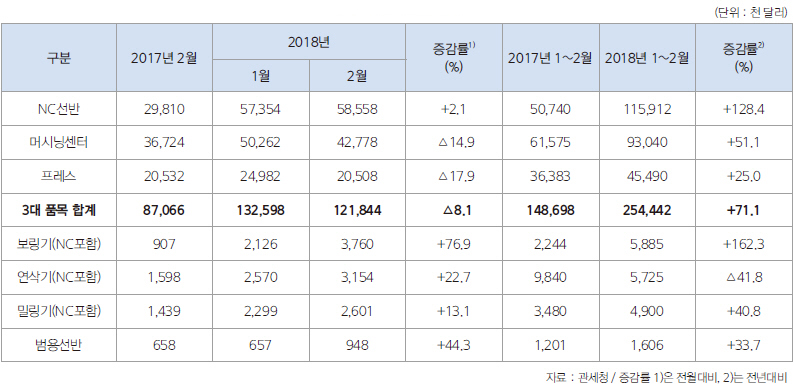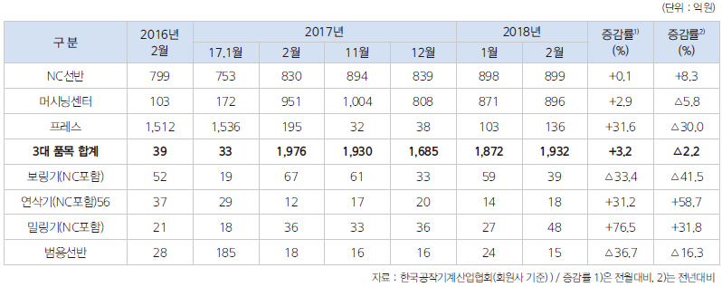 2018년 2월 품목별 수주를 보면, NC절삭기계는 전월 대비 2.3% 증가한 2,401억원, 범용절삭기계는 전월 대비 34.7% 증가한 97억원을 기록했다. 성형기계 또한 31.0% 증가한 140억원을 기록했다.
