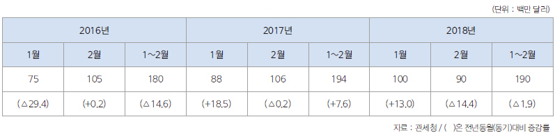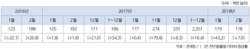 수출은 전년동월 대비 7.0% 감소한 1억7,800만 달러를 기록했다. 1~2월 수출은 전년동기 대비 12.8% 증가한 3억5,700만 달러을 기록했다. 수입은 전년동월 대비 14.4% 감소한 9,000만 달러를 기록했다.