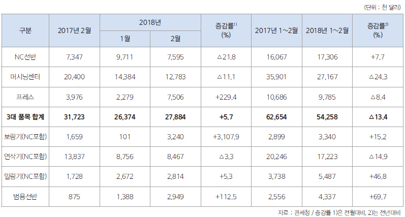 반면, 범용선반(90만 달러, +44.3%), 연삭기(NC포함/300만 달러, +22.7%), 보링기(NC포함/400만 달러, +76.9%), 밀링기(NC포함/200만 달러, +13.1%)는 모두 전월대비 증가하였다.