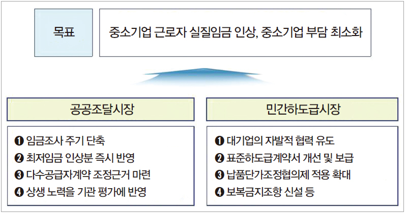 정부는 공공조달 및 민간하도급시장에서의 최저임금 인상으로 인한 중소기업 인건비 부담을 완화하기 위해, 중소기업 납품단가 현실화를 추진한다.