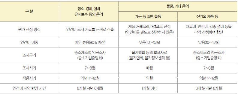 다음으로 정부는 임금상승분 조정치를 계약금액을 사전 반영시키기로 했다. 단순 노무 용역과 같은 저임금 근로자의 경우 최저임금 인상분이 즉시 반영될 수 있도록 개선한다는 것이다.
