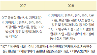 또한, 2018년부터는 스마트팜 도입 농가의 편의 제고를 위해 관수관비·환경관리시설 등 ICT 기반구축 시설·장비와 센서, 제어·영상장비 등 ICT 시설·장비를 한 번의 사업신청으로 동시에 설치할 수 있도록 사업지침을 개정하였다(표1 참조).