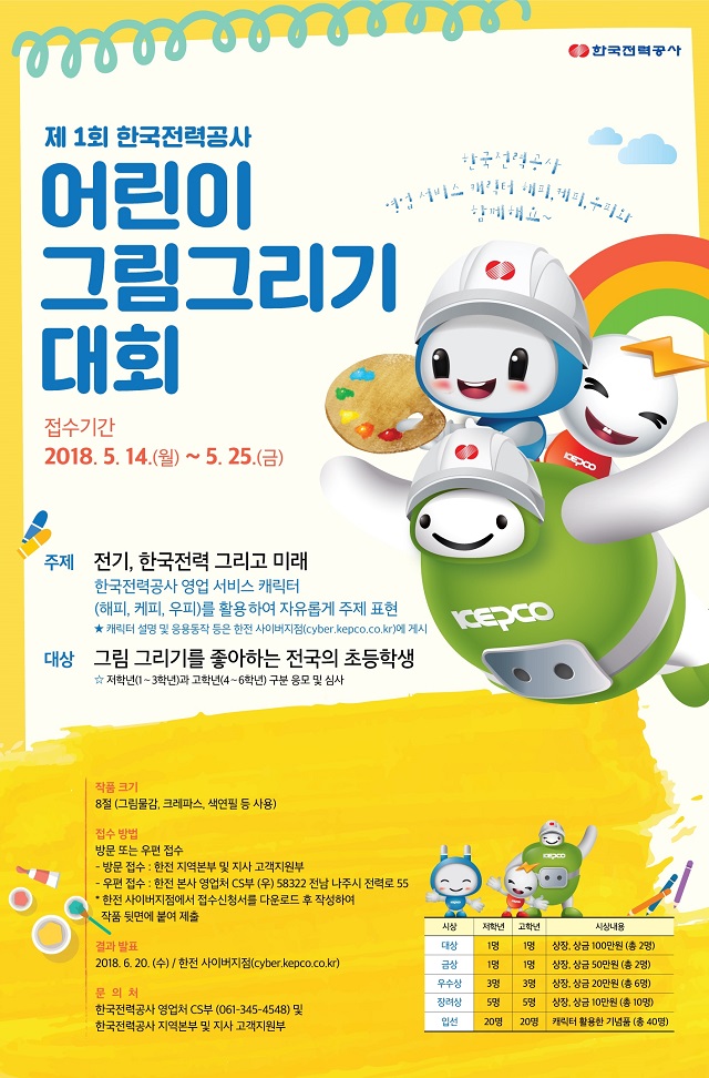김종갑 한전 사장은 “이번 그리기 대회를 통해 우리나라 미래 주인공인 초등학생들이 자신들의 그리기 실력을 뽐내고, 더불어 한전이 하는 일에 대해 조금 더 이해하는 기회가 되기를 기대한다”고 전했다.