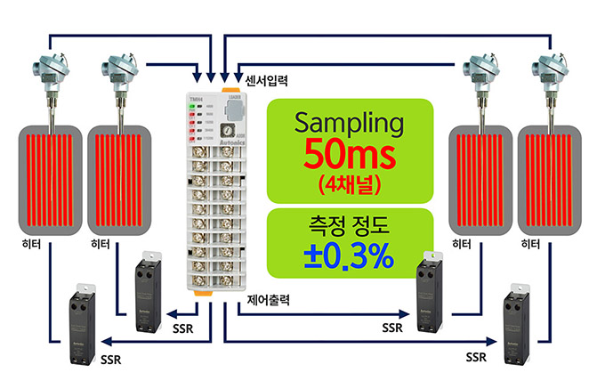 제어 모듈인 TMH 시리즈는 최대 4채널의 개별 입력과 출력이 가능해 최대 4대의 온도조절기 역할을 수행할 수 있다. 또한, 50ms의 고속 샘플링과 ±0.3% 측정 정도를 실현해 정확하고 정밀한 온도 제어가 가능하다.