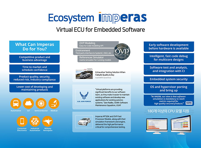 임베디드 가상화 및 보안 SW 전문기업 쿤텍(대표 방혁준)이 가상 머신 기반의 임베디드 소프트웨어 개발 검증 솔루션인 ‘임페라스(Imperas)’를 국내에 출시하고, 자동차 및 전자 기기/반도체 제조, 군수 산업 시장 공략에 나섰다.