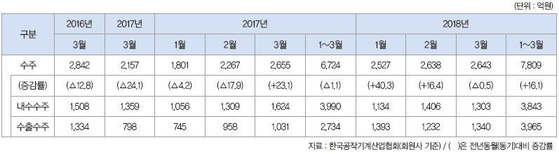 2018년 3월 공작기계 시장은 소폭 호조세를 보였다. 미국 및 유럽을 중심으로 글로벌 경기가 회복되면서 수출 수주가 좋은 흐름을 보여주었다. 3월 수주는 전월 대비 4.4% 증가한 2,643억원을 기록했다.