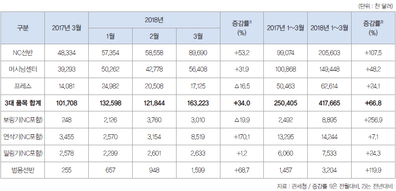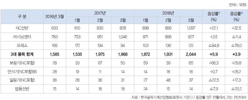 2018년 3월 품목별 수주를 보면, NC절삭기계는 전월 대비 5.9% 증가한 2,543억원을 기록했다. 반면 범용절삭기계는 전월 대비 22.0% 감소한 76억원을 기록했다. 성형기계 또한 82.3% 감소한 25억원을 기록했다.