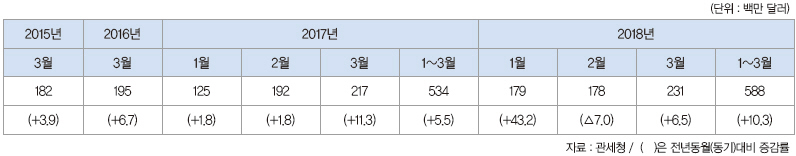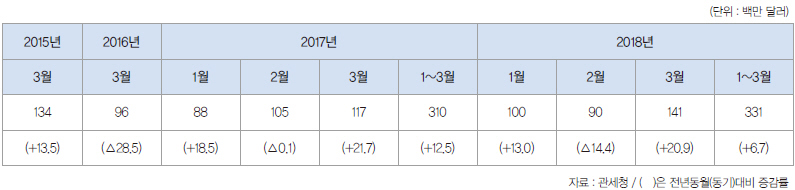 2018년 1~3월 지역별 수입에서는 아시아(2억1,500만 달러, 64.8%)와 유럽(1억400만 달러, +31.3%), 북미(1,200만 달러, +3.7%)지역 모두 전월 대비 증가하였다.