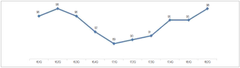 백화점은 97을 기록했다. 이는 전분기보다 13포인트 오른 수치로 경기전망이 ‘중립’에 가까워졌다. 한동안 침체됐던 패션 매출이 조금씩 늘어난 가운데 한한령 해제 등에 따른 외국인 관광객 증가에 대한 기대감이 반영됐다. 서울 소재 백화점 관계자는 “봄이 되면서 중국인 관광객을 포함한 내방객이 늘어나면서 패션과 명품의 판매가 살아나고 있다”고 말했다.