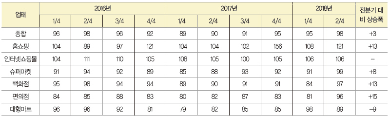 슈퍼마켓과 편의점은 전분기 대비 각각 8, 15포인트 상승한 99, 96으로 조사됐다. 야외활동이 많아지는 봄을 맞아 기대감이 커진 것으로 해석된다. 편의점은 간편식, 신선식품, PB상품 등으로 판매품목을 늘리며 돌파구를 찾아가는 모습이다.