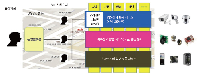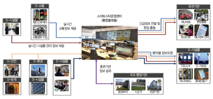 스마트시티 통합운영센터는 방범·방재, 교통, 시설물 관리 등 지자체의 각종 도시 서비스를 제공하기 위해 여러 정보시스템을 연계·통합 운영한다.
