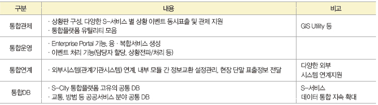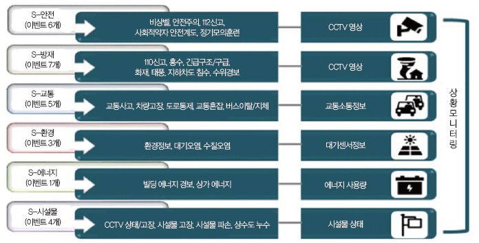 이벤트 처리: 스마트시티 통합플랫폼은 CCTV 영상, 교통소통정보, 기상정보, 시설물 정보 등의 상시 상황 모니터링과 함께 S-안전 분야 이벤트 등 다양한 이벤트 처리를 지원하며, S-서비스 추가에 따라 도시 상황관리 분야(이벤트)가 계속 확대 될 수 있음