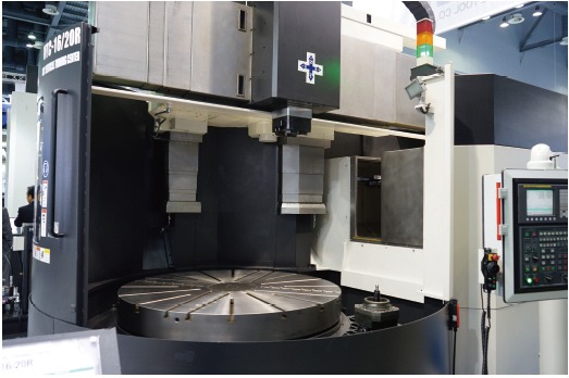CNC 수직 선반 ‘VTC-16/20R’은 테이블 직경 ø1,200㎜, 최대 스윙 ø1,600㎜의 제품으로 동일 사양의 표준 모델보다 설치 면적을 최소화 했으며, 라운드 타입 경사 구조로 칩 및 절삭유 배출이 용이하다. 또한 툴 클램프 방식(쐐기형 연소실) 변경으로 체결력을 증가시켜 티타늄, 인코넬 등이 낙삭재 가공이 가능하다.