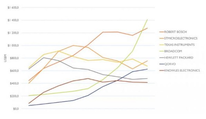 시장조사 기업인 Yole Développement가 지난 5월에 발표한 MEMS 보고서에 따르면, 브로그컴은 2017년에 RF MEMS 매출이 증가함에 따라 MEMS 업계 최고 단골 제조업체를 처음으로 추월한 것으로 나타났다.