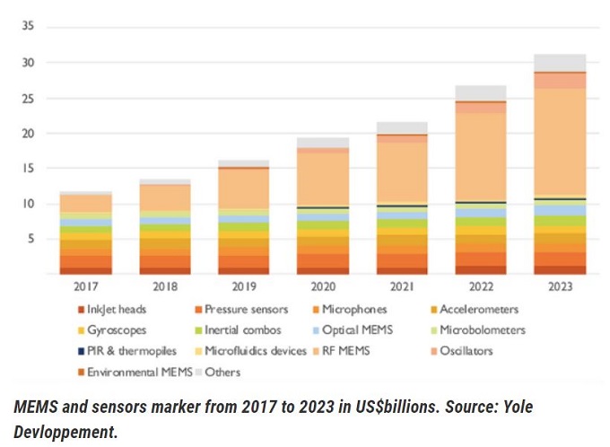 MEMS의 수요를 더욱 증대시키고 있는 것이 모바일 및 자동차의 양대 시장이다. Yole Développement의 예측에 따르면, 2023년의 모바일 분야의 센서 및 액추에이터의 매출은 530억 달러, 자동차 분야에서는 205억 달러 규모가 예상된다고 내다봤다.