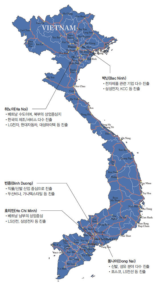 현재 베트남에는 324개 공업단지가 있는데, 이 가운데 FDI(외국인 직접투자) 공업단지가 43개다. 또 해안 경제구역으로 지정된 곳이 16군데다. 특히 베트남 정부는 북부 하노이, 중부 다낭, 남부 호치민에 첨단기술 개발 구역을 지정하는 등 기술 발전을 위한 인프라 확장에 적극적인 노력을 하고 있다.