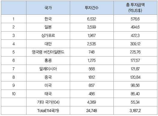 한국 또한 제조가공업 투자 비중이 72%로 가장 높으며, 이어 부동산업, 건설업, 운방창고 순이다.