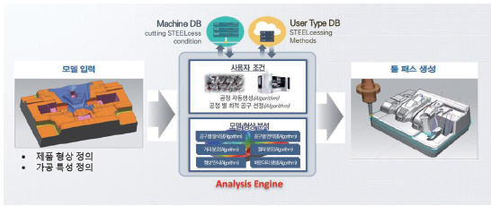 ‘N-CASS Steel’의 주요 특징으로 첫째, 모델에 맞는 공구와 공정을 자동으로 추천한다. 모델 형상과 정의한 금형 특성을 분석하여 최적의 공구와 공정을 모델에 맞게 추천하여 수정이 가능하다. 단, 모델 사이즈가 너무 커서 분석 시간이 오래 걸리는 경우 기준 공구(황삭, 중삭,정삭 등)만 지정하면 된다.