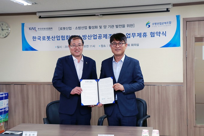 한국로봇산업협회(회장 김승탁)와 소방산업공제조합(이사장 한호연)은 지난 7월 26일 한국로봇산업협회에서 소방산업과 로봇산업의 활성화를 위해 업무제휴 협약식을 개최했다.