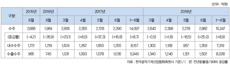 2018년 6월에는 시장 위축 구간을 지났다. 그간 발목을 잡았던 내수 수주도 프로젝트성 수주 발생으로 인해 일시적이나마 상승했고, 수출 수주는 미국의 지속적인 호조 및 유럽의 제조업 경기 회복 등의 영향으로 상승세를 이어 갔다.