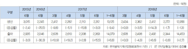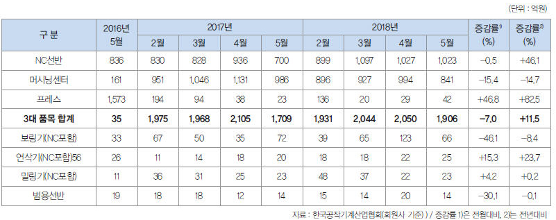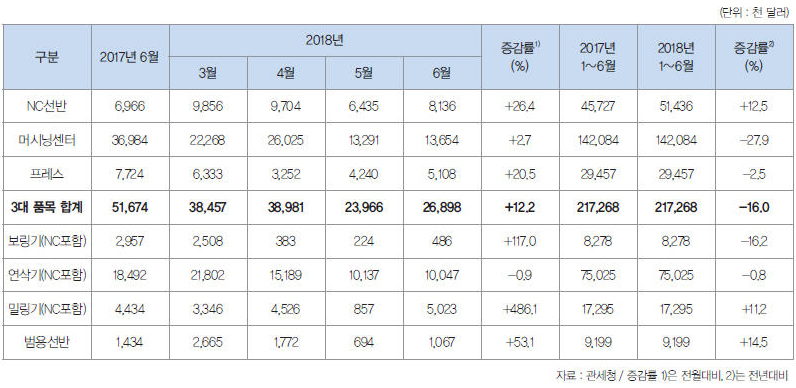 전경련 발표 600대 기업의 2018년 7월 기업경기실사지수(BSI) 전망치는 90.7로 100선을 하회했다. 17개월 만에 최저치를 갱신하였다. 6월 실적치는 91.9로 나타나 2015년 5월부터 38개월 간 기준선 아래에 머물러 있는 상태다. 2018년 6월 품목별 수주를 보면, NC절삭기계는 전월대비 28.2% 증가한 2,773억원을 기록했다. 반면 범용절삭기계는 전월대비 3.1% 감소한 64억원을, 성형기계는 49.6% 감소한 25억원을 기록했다. NC절삭기계 가운데 NC선반은 전월대비 11.4% 증가한 1,139억원을, 머시닝센터는 14.1% 증가한 960억원을 기록했다.