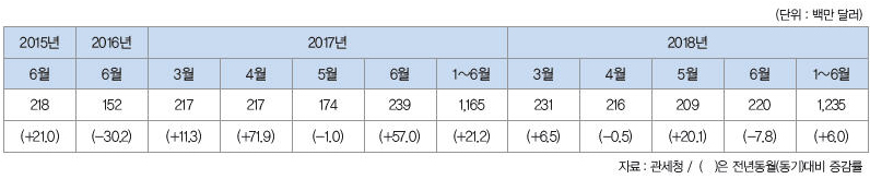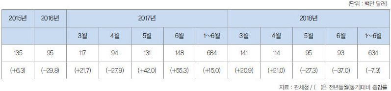 2018년 1~6월 지역별 수입에서는 아시아(4억300만 달러, -7.7%), 유럽(2억100만 달러, -6.7%), 북미(2,100만 달러, -31.3%)지역 모두 전년대비 감소했다.