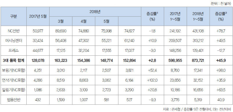 프레스(500만 달러, +20.5%)는 전월대비 증가했으나 전단기·펀칭기·낫칭기(200만 달러, -52.3%), 절곡기(500만 달러, -39.4%)는 전월대비 감소했다.