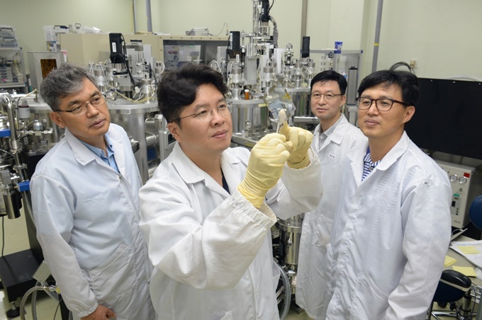 ▲ETRI 연구진들이 유기 나노렌즈가 제작된 샘플을 점검하는 모습(좌로부터 유병곤 박사, 조남성 그룹장, 조두희 박사, 박영삼 박사)