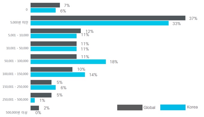 또한, 위협으로 판단된 경보 중 문제를 해결하는 비율은 40%로 절반에 미치지 못했다. 이는 글로벌 평균 50%, 아태지역 53%보다 낮으며, 이번 아태 11개국 조사에서 한국보다 뒤지는 국가는 태국(37%)과 베트남(39%)이 유일했다.