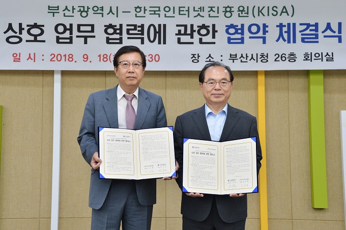 한국인터넷진흥원(KISA, 원장 김석환)은 부산광역시(시장 오거돈)와 부산 스마트시티 안전성을 강화하고 미래 융합ICT 신산업 등을 육성하기 위한 업무협약(MoU)을 지난 18일 부산시청에서 체결했다고 밝혔다.