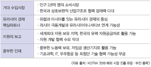 한국과 러시아의 무역 규모는 크지 않다. 관세청의 수출입무역통계에 따르면 2017년 한국의 러시아 수출금액은 69억661만 달러이고, 수입금액은 120억3,953만 달러이다. 러시아의 수입 국가별 순위로 보면 한국은 17위다.