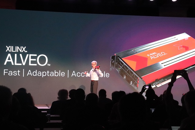▲ 자일링스 CEO 빅터 펭이 자일링스 개발자 포럼에서 새로운 가속기 카드, '알베오 시리즈'를 공개하고 있다. <사진 : 김동원 기자>
