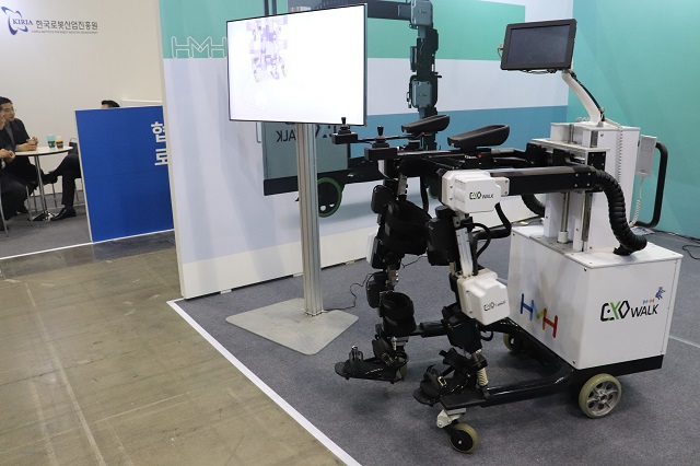 재활로봇 전문업체 HMH는 보행 훈련을 위한 ‘엑소워크(Exowalk)’를 전시했다. 엑소워크는 자동화된 형태로 효과적인 재활과 정확하고 빠른 보행 훈련을 유도하는 로봇이다.