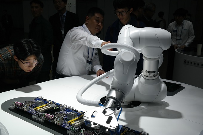 ▲ 협동로봇 'M1013'으로 전자기판 조립을 시현하는 모습