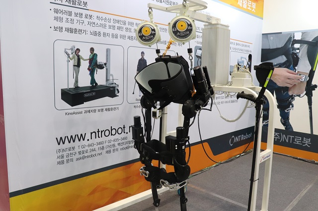 NT로봇이 케어밀과 함꼐 전시한 리워크는 환자들의 보행을 위한 웨어러블 로봇이다. 척추 손상 등으로 하반신이 불편한 환자의 재활과 이동을 돕는다.