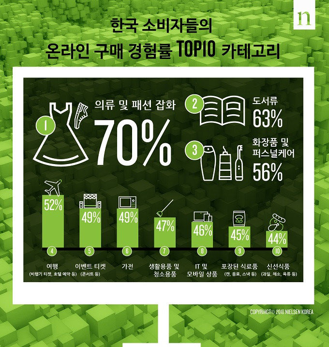 더불어 한국인들의 온라인 구매 경험률이 가장 높은 카테고리는 ‘의류 및 패션잡화(70%)’, ‘도서류(63%)’, ‘화장품 및 퍼스널케어(56%)’, ‘여행 관련 상품(52%)’, ‘이벤트 티켓(49%)’ 순으로 나타났다.