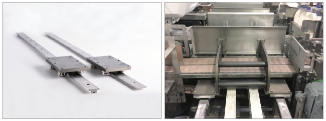 ▲ Hepco SL2 리니어 가이드(왼쪽)와 선반 형태로 우유병을 취합하는데 사용된 예.