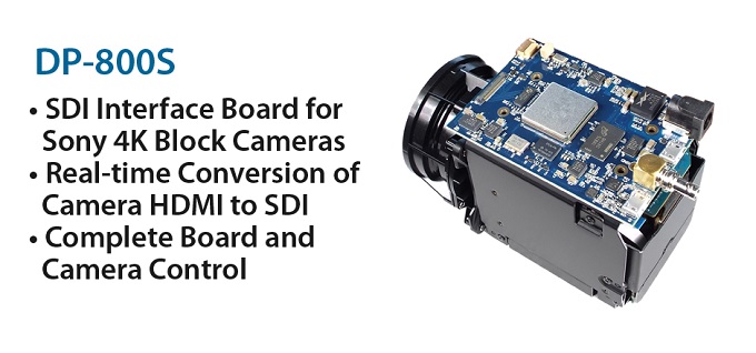 dPict Imaging의 새로운 DP-800S 인터페이스 보드는 Sony 4K 블록 카메라의 비디오 데이터를 SDI 형식으로 변환하고 단일 BNC 커넥터를 통해 레벨 A 또는 레벨 B 6G-SDI 출력을 지원한다. DP-800S 'FPGA는 최대 12.5G의 주파수를 지원하는 통합된 첨단 신호 컨디셔닝 및 클록 데이터 복구 기능을 갖춘 다중 고속 및 저지연 트랜시버를 특징으로 한다.