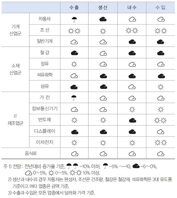 조선, 철강, 가전의 생산증가세 전환에도 불구하고, 자동차, 석유화학, 섬유, 디스플레이의 생산 감소세의 지속, 그리고 반도체, 이차전지, 일반기계 등의 생산 증가세가 소폭 둔화하면서 생산 증가를 제약할 것으로 전망됐다.