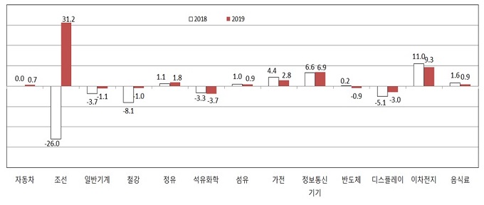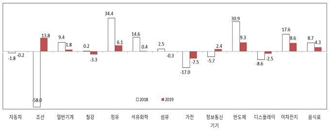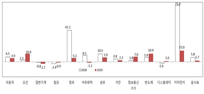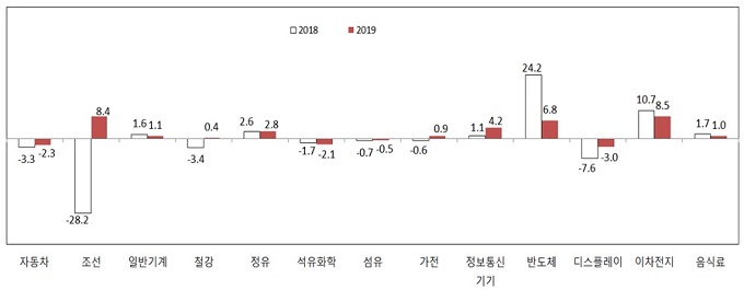 소재산업군의 경우, 정유는 국제유가의 안정화로 석유제품 수출단가 상승폭 제한, 글로벌 석유제품의 수요확대 추세 둔화 및 주요국의 대규모 정제설비 가동으로 인한 공급확대 추세 가속화 등의 영향으로 6.1% 증가할 것으로 전망됐다. 석유화학은 글로벌 경기 둔화 속에 수출단가 보합세가 유지되며 0.4% 증가, 철강은 수출경쟁이 심화되고 단가 하락으로 3.3% 감소할 것으로 전망됐다. 섬유는 글로벌 경기 성장세 둔화에 따른 글로벌 섬유 수요 부진과 수출단가 인상 제약으로 0.3% 소폭 감소세로 전망됐다.
