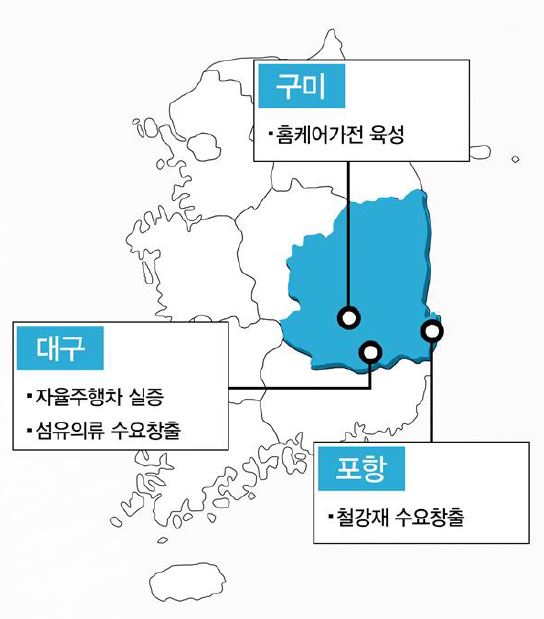 대구·경북은 주력업종인 전자‧섬유산업의 해외이전과 자동차부품, 철강산업의 어려움으로 지역경제 부진이 계속되고 있어, 자율차, 홈케어가전 등 미래산업 인프라를 집적하고 섬유·철강 등의 新수요를 창출한다. 즉, 대구는 자율차 실증 인프라 구축 및 시범운행, 공공부문 고부가가치 섬유 활용 촉진 등이 추진된다. 구미는 홈케어가전 거점화, 포항은 공공 SOC 투자확대로 중소 강관업체 일감 확보가 지원된다.