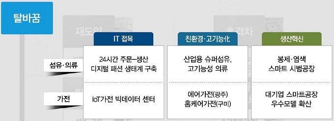 섬유·가전: 4차 산업혁명 기술을 접목하여 전통산업을 첨단 스마트산업으로 탈바꿈한다. 세부적으로 ▲ 동대문 중심으로 주문~생산이 24시간내 완결되는 디지털 패션 생태계 구축 ▲ 인건비 부담이 큰 봉제‧염색 분야는 스마트공장으로 전환 ▲ 중소‧중견 가전업체를 위한 빅데이터 센터 구축 및 신제품 실증 지원 등을 추진할 계획이다.