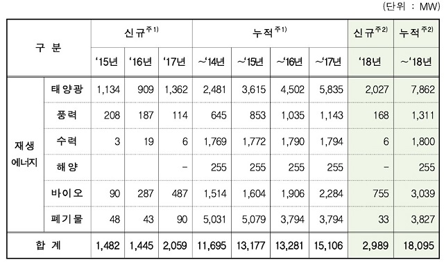 산업통상자원부는 2월 14일, ‘재생에너지 3020 이행계획’ 원년인 2018년 한 해 동안 보급목표의 172%에 해당하는 2,989MW(잠정)의 재생에너지설비를 신규 보급했다고 밝혔다.